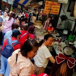 Nach dem Frühstück bestellen wir uns ein Grab bis zur nächsten SkyTrain-Haltestelle und fahren von dort aus mit der Bahn ins Stadtzentrum. Chinatown ist schon eine kleine Hausnummer. Überall Gewusel, überall Autos und Motorräder. Wir stell aber fest, dass auch hier das Marrakesch-Prinzip funktioniert. Man muss nur fest daran glauben, dass nichts passiert und beherzt auf die Straße oder den Zebrastreifen treten, wenn eine kleine Lücke zwischen den Fahrzeugen entstanden ist. Sie halten mit hoher Wahrscheinlichkeit an. 😉 Hasi ist da wesentlich mutiger als ich.