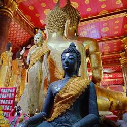 Heute jedenfalls sind wir um die Mittagszeit bei über 30° C fast die einzigen Besucher im Wat May Souvannapurmaram. Es ist ganz ruhig und die Stimmung fasst mich total an. Vielleicht war da ja mal was in einem früheren Leben... 😉 Es ist so schön dort, dass ich gleich zweimal um den großen Buddha rumlaufen muss. Buddhas sind von hinten ohnehin viel schöner. 😁