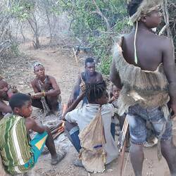 Dann gehen wir gleich los, denn sonst ist die Beute weg, wenn es zu warm wird. Sie sind so schnell und wir kommen kaum hinterher, wir müssen durch Gestrüpp kriechen und schnell sein. Irgendwann entdecken sie ein Eichhörnchen im Baum, sie umzingeln es und nach einer halben Stunde schießen sie es mit ihrem Pfeil und Bogen vom Baum runter. Armes Eichhörnchen! Es tut mir schon sehr leid, aber die Familie muss ernährt werden. Wir gehen weiter und kurz darauf sehen sie einen Affen. Auch hier sehen wir zu, wie sie versuchen, den Affen zu töten. Dieses Mal geht es noch schneller als beim Eichhörnchen. Ein Schuss mit dem Pfeil und der Affe fällt tot vom Baum. Leo und ich sind ziemlich mitgenommen. Die Hadzabi freuen sich und machen ein Feuer mithilfe zweier Holzstöckchen und legen den Affen darauf. So brennt das Fell ab und er wird leicht gegrillt. Dann holen sie ihn aus dem Feuer und essen ein Stück, auch uns bieten sie ein Stück an. Micha und Leo probieren, aber ich weigere mich. Nicht ein Affe!!