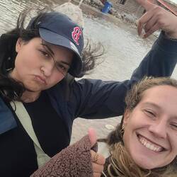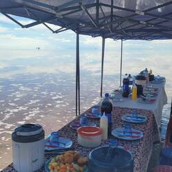 Beim ersten Stopp haben wir einige Fotos gemacht, während unsere Fahrer ein Picknick mitten im Nichts aufgebaut haben. Reis, Croquetas, Gemüse und Pasta – einfach surreal. Beim nächsten Stopp war's plötzlich super windig und es wurde eiskalt. Wir entschieden uns, im Auto zu bleiben – einerseits wegen der Kälte, andererseits, weil man 15 Bolivianos zahlen musste, nur um ein paar Fotos mit Salzstatuen zu machen. Da wir schon beim ersten Stopp genug Bilder geschossen hatten, haben wir uns das gespart. 😊