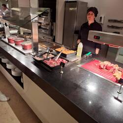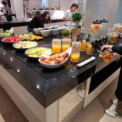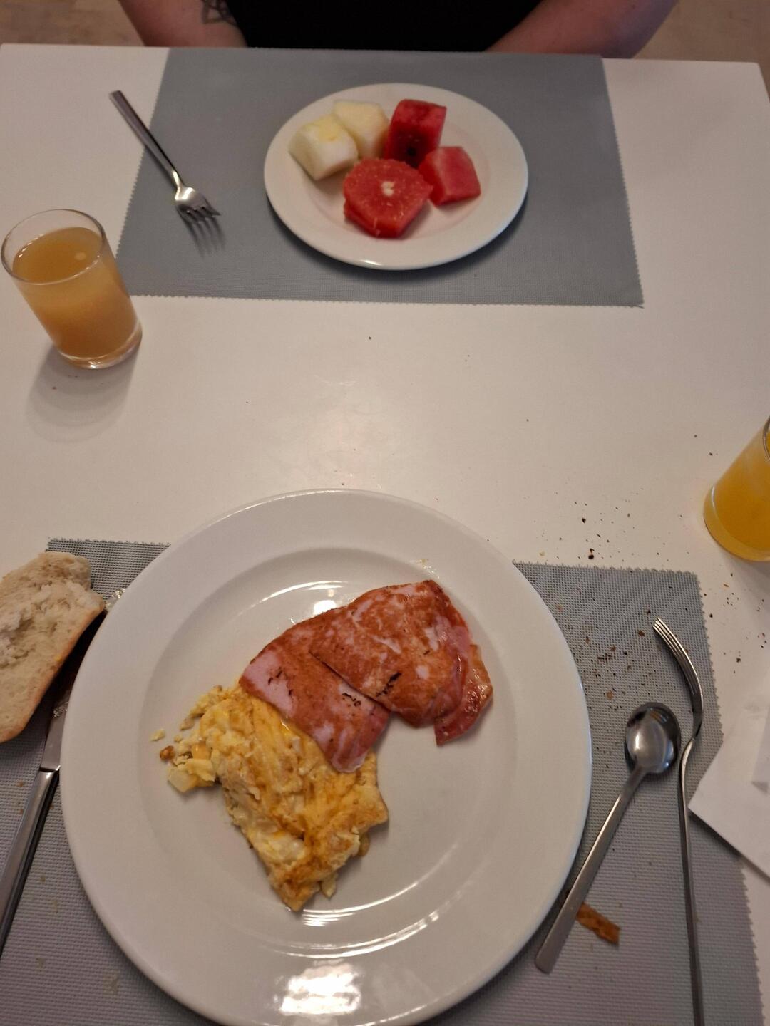 Da una parte frutta fresca, dall'altra bacon e omelette