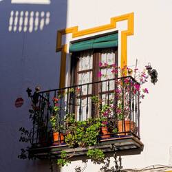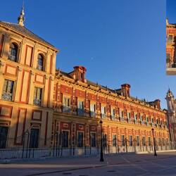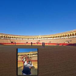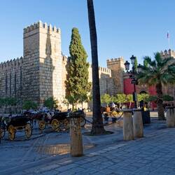 Wir nehmen den Bus M-132 um 11:30 Uhr nach Sevilla zur Plaza de España. Es ist Sonntag und es herrscht ein reges Treiben. Der halbrunde Bau, versehen mit Klinkern, Marmor und und einen DurchmesserLeia mais