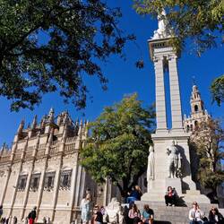 Heute morgen ist es noch kühl und nebelig. Wir nehmen den Bus 10 Uhr nach Sevilla und schlendern zur Kathedrale. Heute mal einen anderen Weg, entlang an einem Denkmal fürBaca lagi