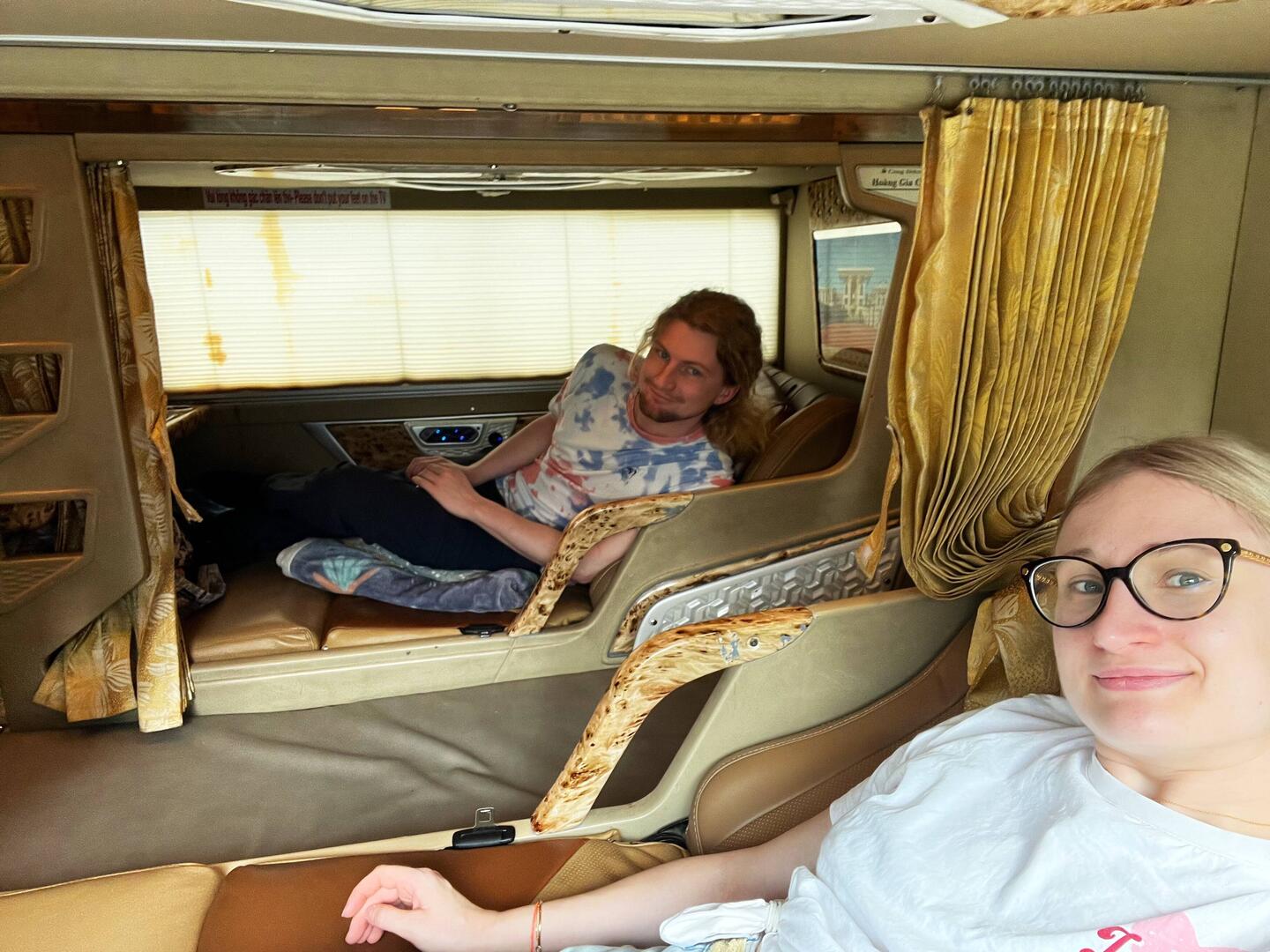Aujourd’hui nous avons attendu notre chauffeur (qui avait 1h00 de retard, sans nouvelles de sa part, ce qui nous a un tantinet stressé), et nous avons fait 7h00 de bus couchette (très confortableBaca lagi