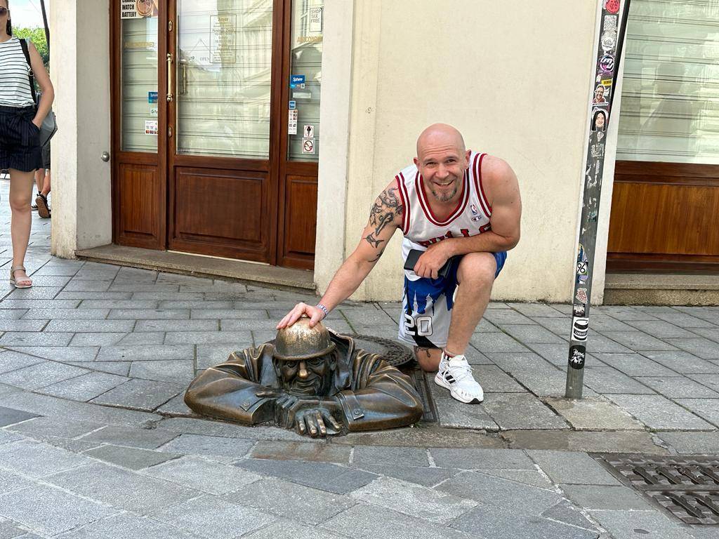 In Bratislava besuchen wir Čumil. Eine Legende besagt, dass ein Wunsch wahr wird, wenn man den Kopf des Mannes berührt….