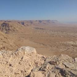 King Herod the Great built a lavish palace on Masada’s summit between 37-31 BC with towers and a fortified high wall. He cultivated the desert fortress into an oasis, with Roman bathhouses, cisterns, and storehouses. It was a natural fortress built on top of a barren mountainous desert plateau 1500 feet high. The vertical face of the rock plateau drops 820 feet on the east and 600 feet on the west. We traveled by cable car up to the mountain top fortress of Masada (some hiked up the snake path, instead of using the cable car.)Läs mer