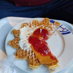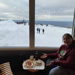 Wir sind am Nordkap, essen leckere Waffel mit sour cream, brown cheese und jam. Oder einen Lachsbagel 👍