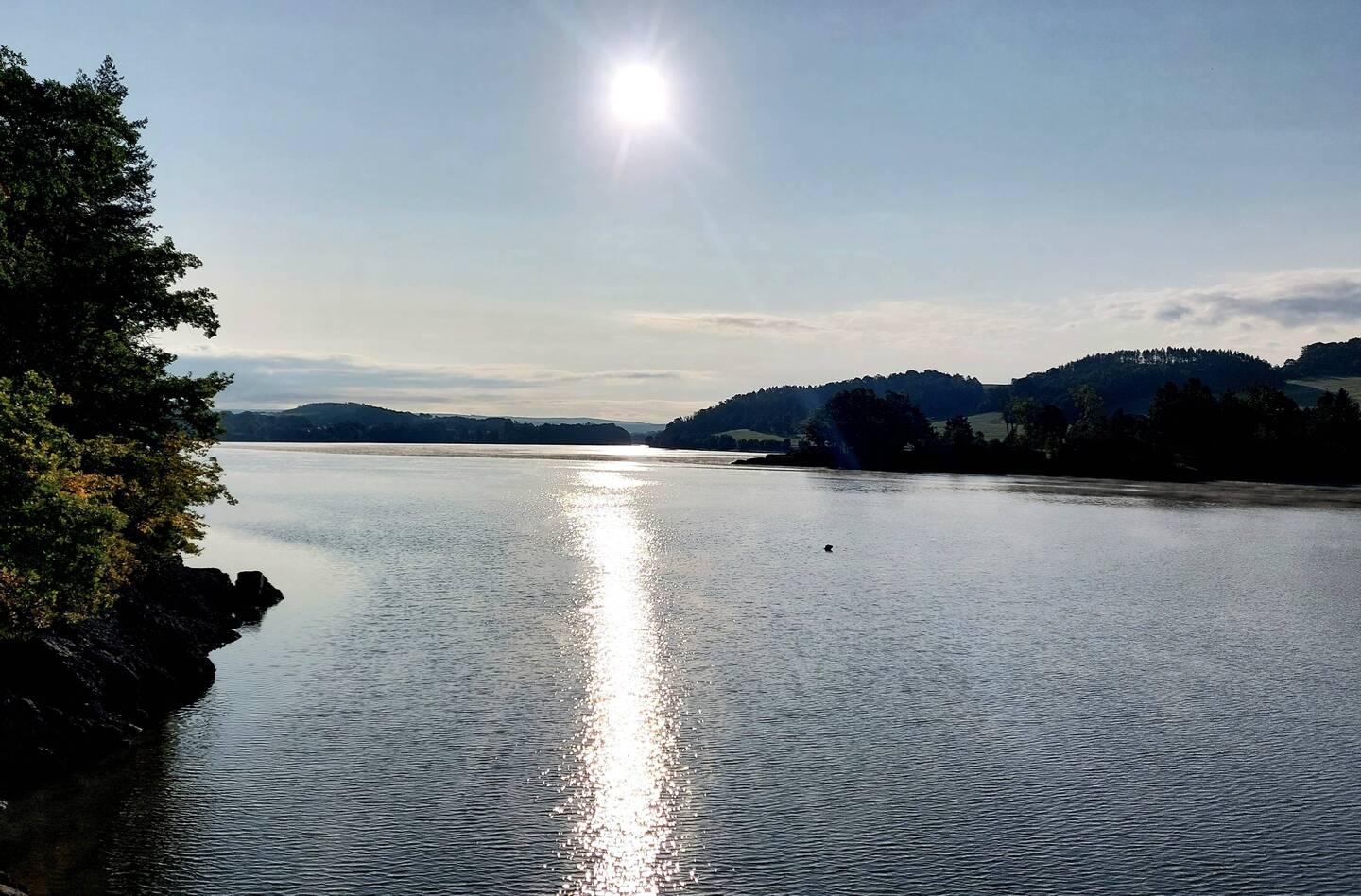 Mit Sonnenaufgang über der Talsperre Pirk.