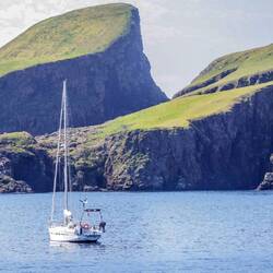 Left Papa Westray 9am expected west wind and a simple sail to the north of Ronaldsay. As always the weather here changes fast and the wind was in the north. South of Ronaldsay it was, we were late on the tide to get through the sound. After an hour of sailing we added some engine to make sure we made it through before it built to the predicted 6 kts against. Fate was on our side as we pushed foul tide. 2 Orca cruised past with the tide on a hunting expedition. Tall Dorsal fins there first give away then a couple of dives and porpoising. They were a real treat. We broke out into the open see and good tide sent us north towards Fair Isle. 15nts old wind just off the beam and very little swell. The sun came out, Champagne sailing couldn’t be better. 5 hours later we had reached Fair isle, where we had been beaten by the dreaded cruise ship. Luckily they were on a short visit only to the south of the island.