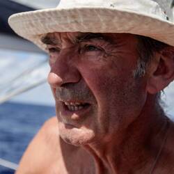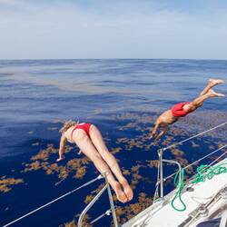 We get becalmed with a thousand miles to go. So we nose the boat into a raft of weed and decide to take a swim. Very weird sensation so far off shore. The are rumours of big fish hiding under the weed islands and Rob cant help to see if he can wheedle one out. He fails with a big one but manages a couple of small shoul fish for the pot.