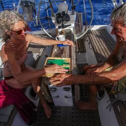 Who would have thought it 3rd week at see. Routine and books and good food making the time pass easily. One of my favourite things for a long trip is to see different wild life, dolphins have been in short supply for a while but as we get within a 1000 miles of land we will start to see them again. Even sea birds are much rarer than they have been. Flying fish storm petrels and the odd sight of a giant tuna breaking the surface is all we have had for the last week. Fishing has continued to be good with staple catch now being small tuna rather than Mahi Mahi. We have seen several cycles of the moon on this trip and each night the skies never gets old. With so little light pollution the stars and now Elon musk saterlites form in what seams like clouds. I have a particular memorable night where it was 3 am the boat was driving along in flat water with a cloudless star congested sky. I stood on the cockpit seat in 27 c in just my shorts and head phones (apparently on watch) dancing to my 80 playlist. Not an easy scenario to repeat in a hurry.