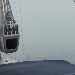 When the blow comes it builds steadily from almost nothing over 3 hours mostly between 30 and 40 kts for 12 hours overnight. It rain 1 inch per hour during this period and Rob and I get totally soaked. We are reefed down to minimum on the main and we leave out the fall inner staysail. Diedre our wind pilot love s this balance and is very content to steer us happily through the storm. We go inside, dry off, make dinner. And get warm. The boat handle beautifully almost with out any further help from us. We keep watch via the Radar and AIS Chart plotter with the odd peer out. The wave are big and dangerous out side we are 300 miles offshore, but Morvenna gives a feeling of a very safe Cacoon. By lunch time the following day the wind has gone, Completely, and left a nasty large swell behind for us to wallow in. What could be worse. Oh yeah Pea soup fog. For the next 36 hours. Engine on and a close eye on the Radar ETC. luckily Rob finds my joke and stories very entertaining.