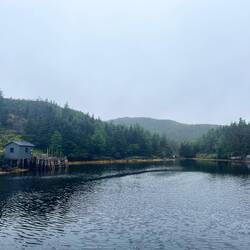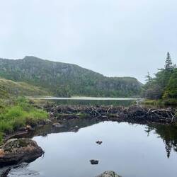 After finaly checking in with Canadian Customs we decide to leave Argentina as it is a very commercial ferry port. Indian Harbour on Merasheen Island has been on the charts for 200 years as a good storm hole. There a small storm coming and we fancy something remote. It’s about a 20 mile sail to what should be an un inhabited and wild island.. Its thick for as We set off but that doesn’t put off the atlantic white sided dolphins from coming to play. We are doing 7knots again in 25 knots of breeze in thick fog. What could go wrong. The vis is just clear enough as we enter to make our way through the curving passage. We drop the hook in a position that should be good for the forthcoming storm. But run lines ashore just in case we misjudgeed it. Every stop is new and every situation is a guess. Dinghy in and off for a stomp through the trees. 300 metres through the trees is a lake which has been created by a beaver with a big bushy dam. Mr Beaver has managed to hake a 7 or 8 acre lake for himself. Might have been there for generations, I will fly fish later to see if he comes out in the twilight.