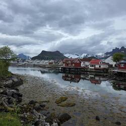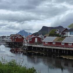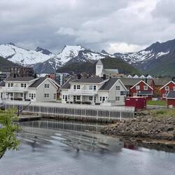 Hier gibt es noch viele schöne rote Häuser und Fischerhütten, aber auch viele moderne Häuser, die nicht so richtig zu den Lofoten passen.