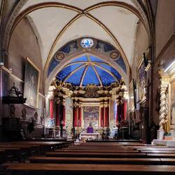 Bergdorf mit Kapelle hoch über dem Dorf.