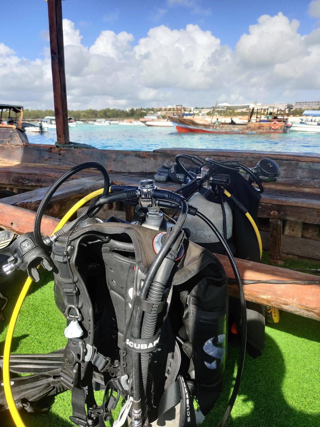 At 7.30 am I've gotten picked up and after a drive of about 40mins we arrived at Muyuni Beach, where we embarked the boat. The dive equipment and everything was already set for us, so we only needed to dress properly with our dive suits. The boat ride was not too long, until we've gotten the sign to "fall over board". Together with a local Divemaster and one more guest, we've been following a very slight current. The visibility was great and it felt as we're swimming in an aquarium. The highlight however, was for sure a reefshark, which was hiding himself in a little cavern. Nevertheless, as I've been just with a shorty, I was not that sad to go back to the surface after a while 🥶. At the break on the baot, we've been served with some fruits and we enjoyed the sun to get ready for the second dive. As well this one was as spectacular as the first one and we found even a second little shark. What a beautiful day!