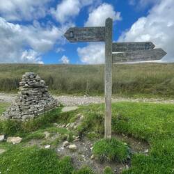 What a day! Rain rain and more rain meaning wet wet wet. If it wasn’t heaving down I was stomping through very soggy moorland pastures. 500m elevation gave me some awesome views of pen-y-gent as I was crossing into Cumbria along a Roman road.. I saw a stone circle called a ring cairn that the book says dates about 4000 yr ago to the Bronze Age.