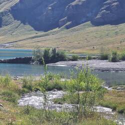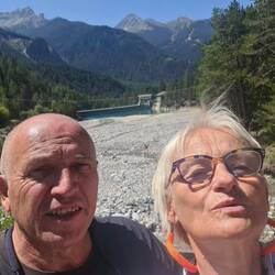 Zjutraj sva krenila po prelazu k jezeru. Polno avtodomov je tam prenočevalo. Lepo in neokrnjeno jezero. Sva šla hodit v hrib do jeza in trdnjave. Drugič sem vzela palice😇. Kužku je bilo precejLue lisää