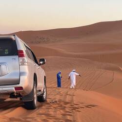 Wir bekommen eine Privattour in die Dünen mit Mohamed, dem Hotelier. Er fährt mit seinem Landcruiser vor, wir folgen mit auf 1,2 bar abgesenktem Luftdruck. Die Reifen sind dann fast platt und habenLue lisää