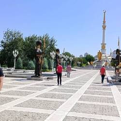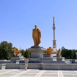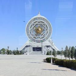 Gestern saßen wir noch beim Ziegenhirten in seiner Butze und heute, 50km weiter stehen wir in der Stadt des weißen Gigantismus, Ashgabat. Alles ist prächtig, riesig, sauber. Der Herrscher lässt sich hier eine Puppenstube bauen, fern jeglicher Realität. Die Straßen sind breit, teilweise im Winter beheizt, und es sind vereinzelt Autos und Menschen drauf zu sehen. Hier steht auch das größte weil einzige Indoor-Riesenrad der Welt.
