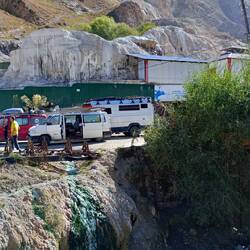 Der Eingang zu den Quellen erinnert etwas an Pamukkale, erstaunlich ist dass man hier nackt in das Becken steigt. Das Wasser hat gute 45°, und wirkt sehr entspannend.