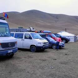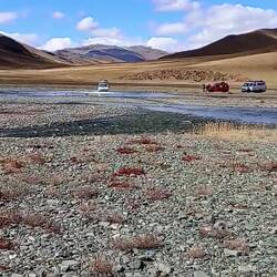 Nach kurzem Anstieg fahren wir auf einer Hochebene am Rande der Wüste Gobi entlang, am Horizont immer die Berge des Altai Gebirges. Tagsüber ist es immer noch angenehm warm, nachts zieht leichterBaca selengkapnya