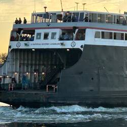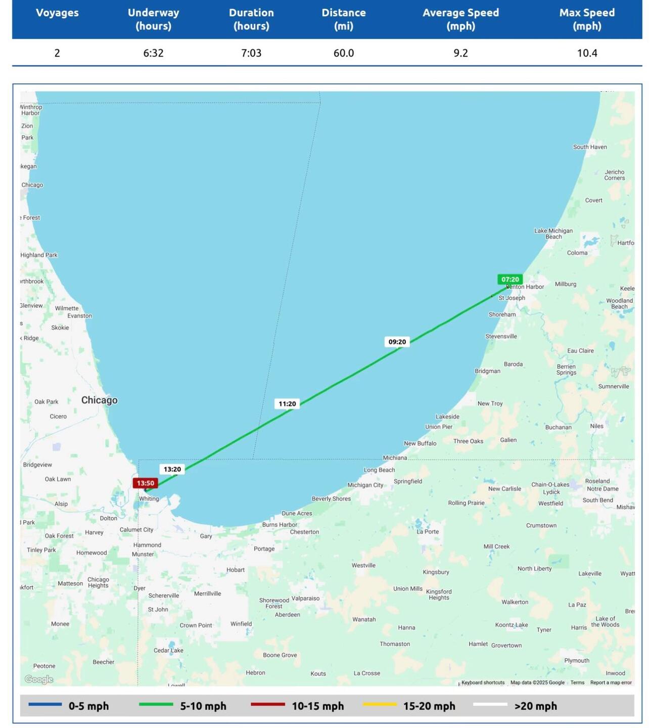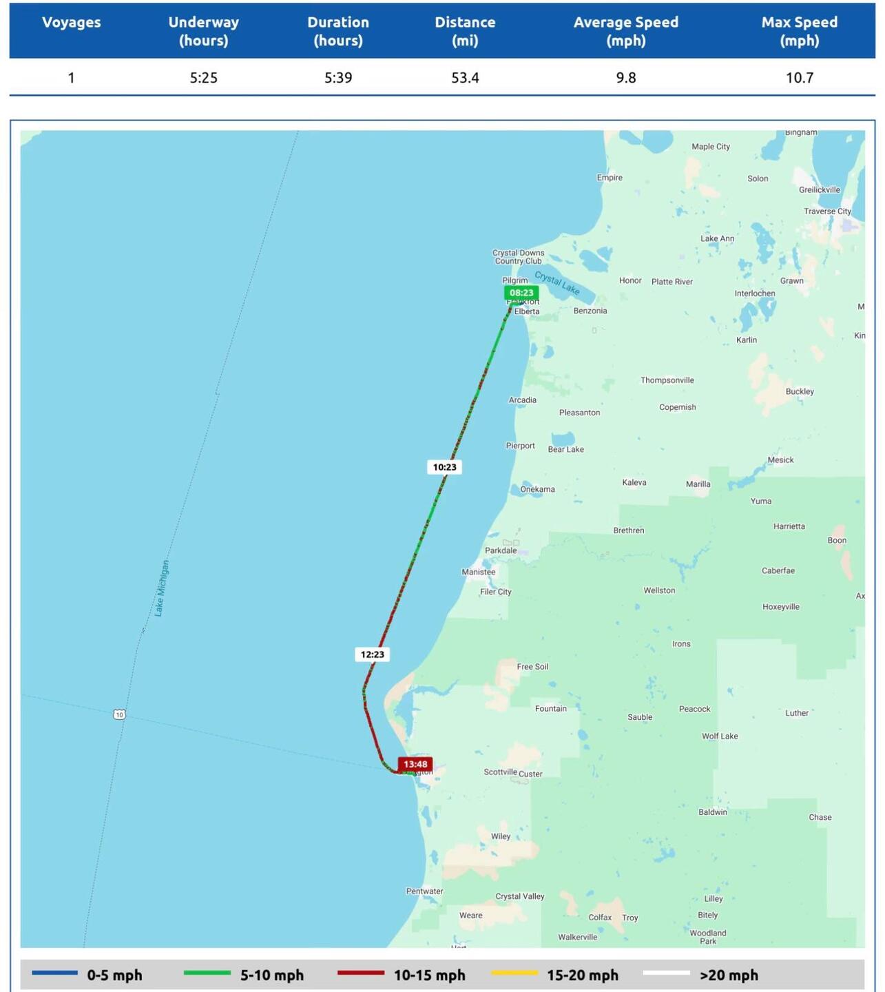 We’re abeam the Big Sable Point light at 1235 and turn in short of our marker, to clear the way for a northbound tug-and-barge. We're only going to Ludington because we have to watch the "S.S. Badger" arrive from Manitowoc, and its famous 'drop-the-anchor' pirouette to berth stern-to. If there's time, I intend to check out the Maritime Museum too (as it turned out, the website said it was open, but when Rosie and I got there it was not).