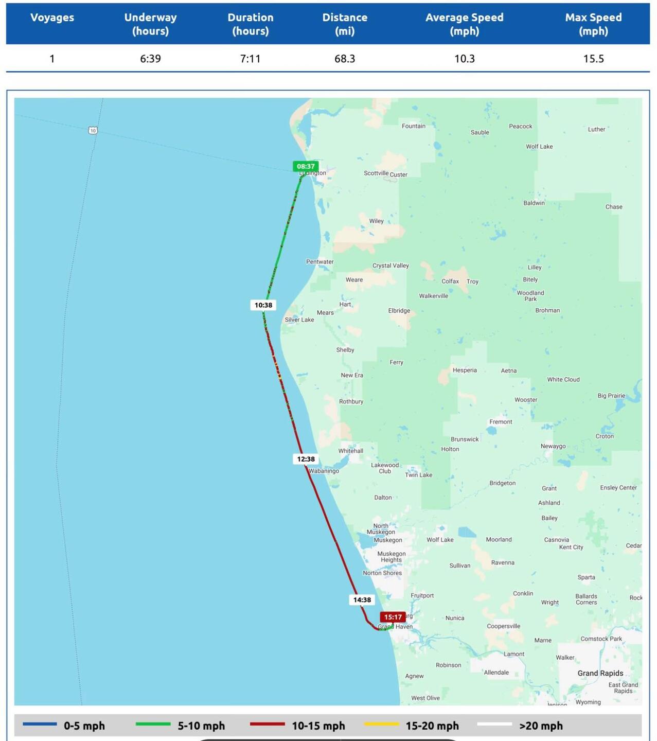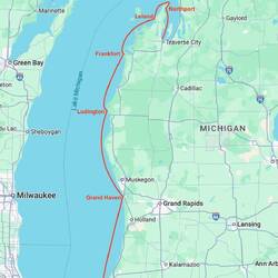 The day was uneventful, passing abeam the Silver Lake dunes and the Little Sable Point lighthouse, then the inlet to Muskegon, from which I'd sailed on the fast Lake Ferry with my rental car back on 20 July, en-route to Chicago.