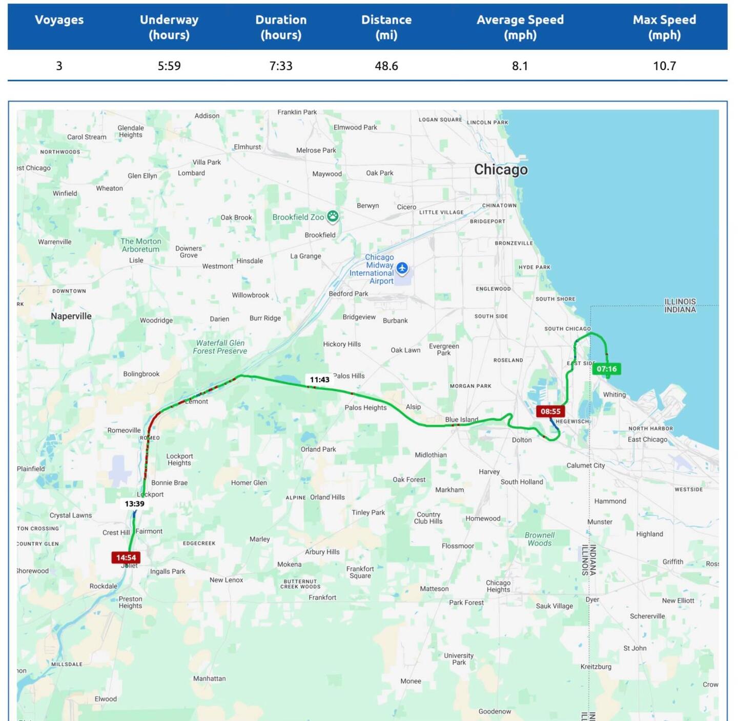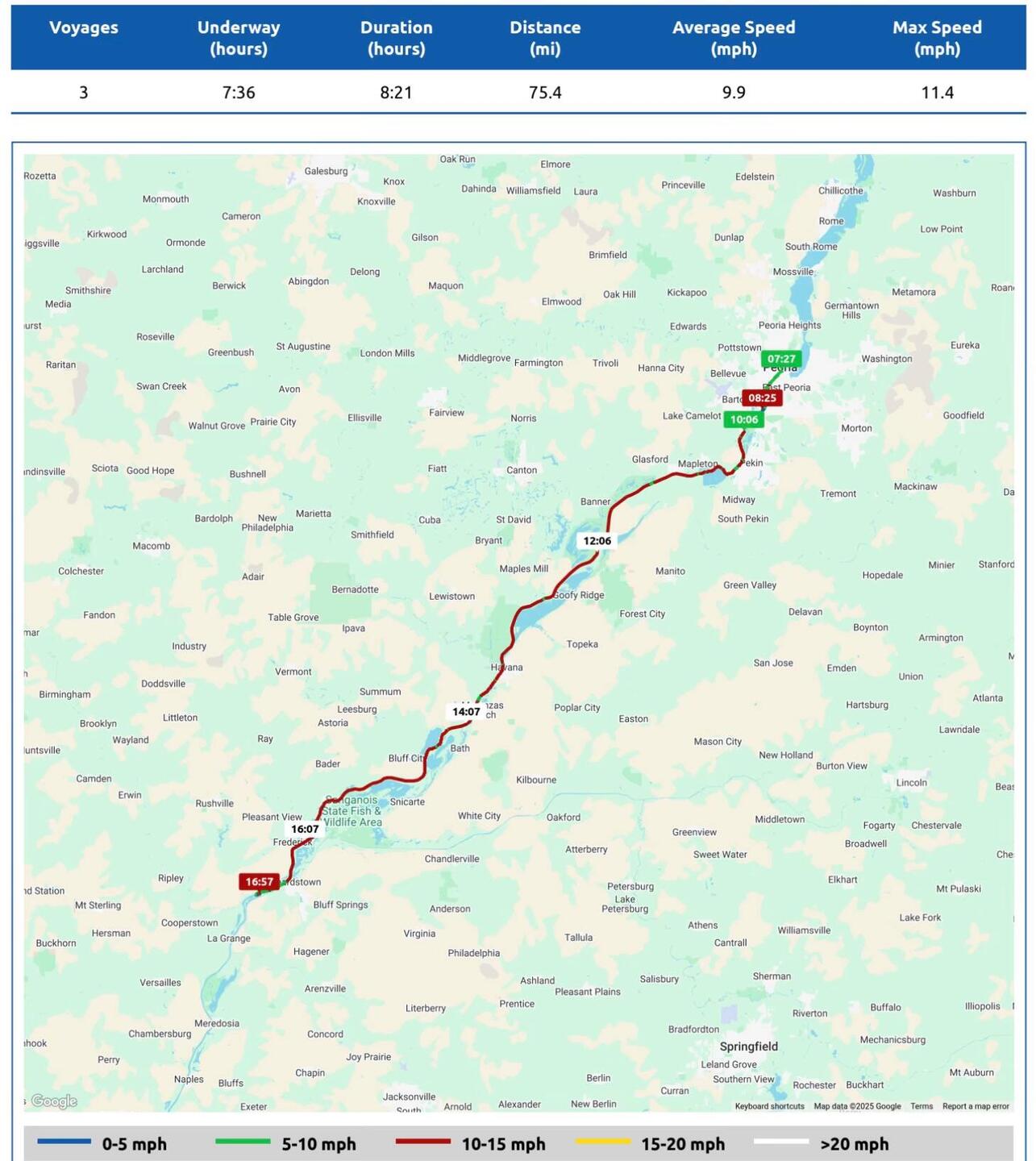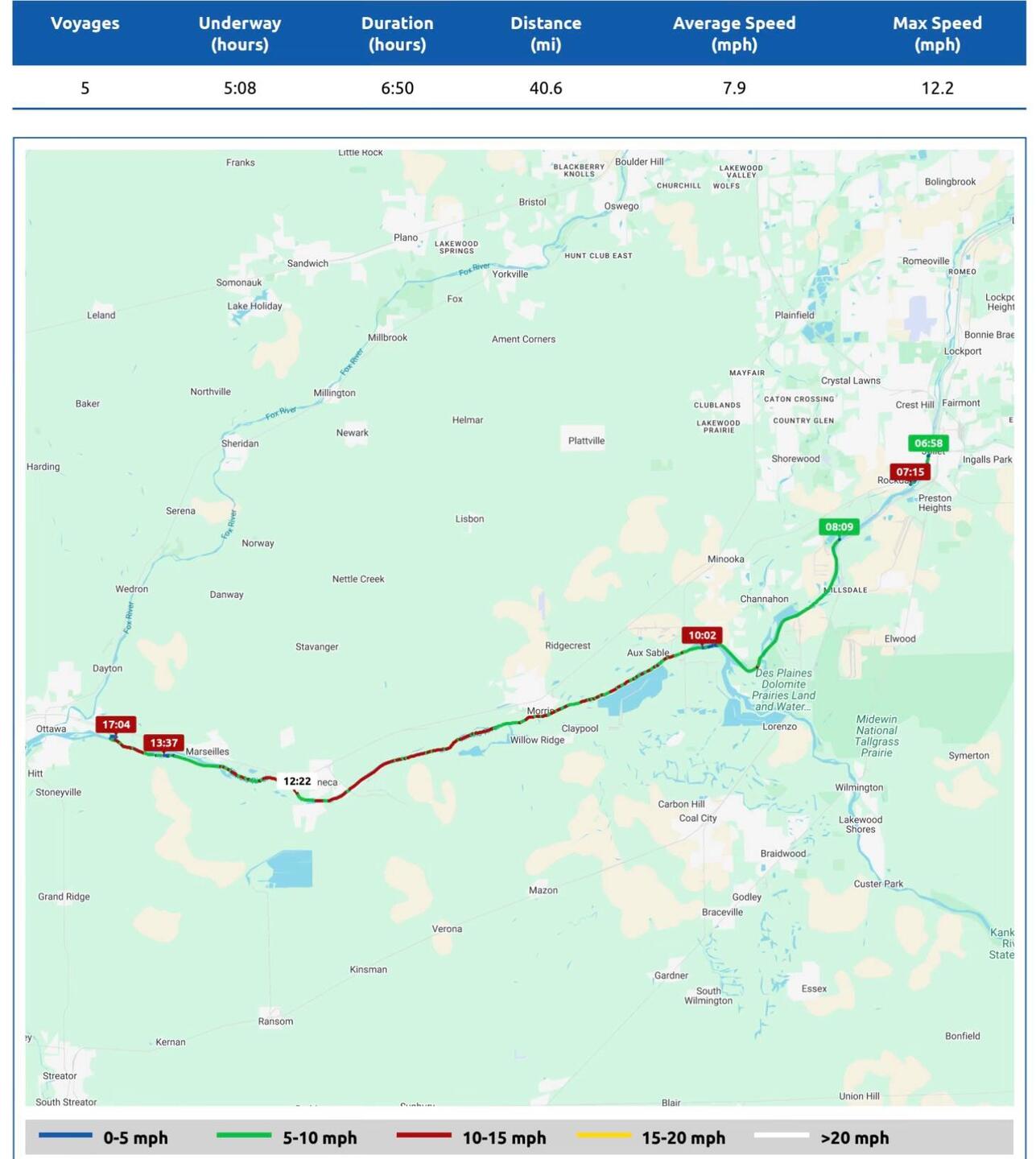 We set off, and passage through the Brandon Rd Lock & Dam is straightforward, as is that at the Dresden Island Lock & Dam (where we pause briefly to allow an upbound tug-and-barge to exit and pass). At this latter point, we have just passed the confluence of the Kankakee River, so we're now in a waterway officially called the Illinois River, which will take us to the Mississippi at Grafton, Il. By this means, we'll have voyaged across the entire breadth of the state of Illinois.