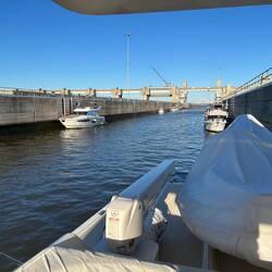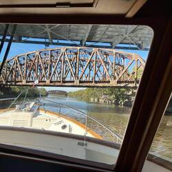 Another 0700 start in order to get through a drawbridge in Joliet before the city's morning rush hour could mature, and be set up to enter our first Lock for the day. Preston confirms with the bridge tender and we ensure two blooper boats that are with us on the wall are aware of this early opportunity.