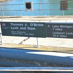 We arrive at Lockport Lock & Dam, wait for an 'upstream' rec fisher's boat to clear, and enter the chamber to tie up to a floating bollard. These make Locking easier, by not requiring whoever is holding the rope(s) to pay it out or ensure it slides down the pipe as the boat descends with the retreating water level. Departure from this Lock means the Ship Canal has ended and we're now in the Des Plaines River. When--after a further 20 miles--we reach the confluence with the Kankakee River near the Dresden Nuclear Power Plant, we'll be in the Illinois River which will take us to the Mississippi.