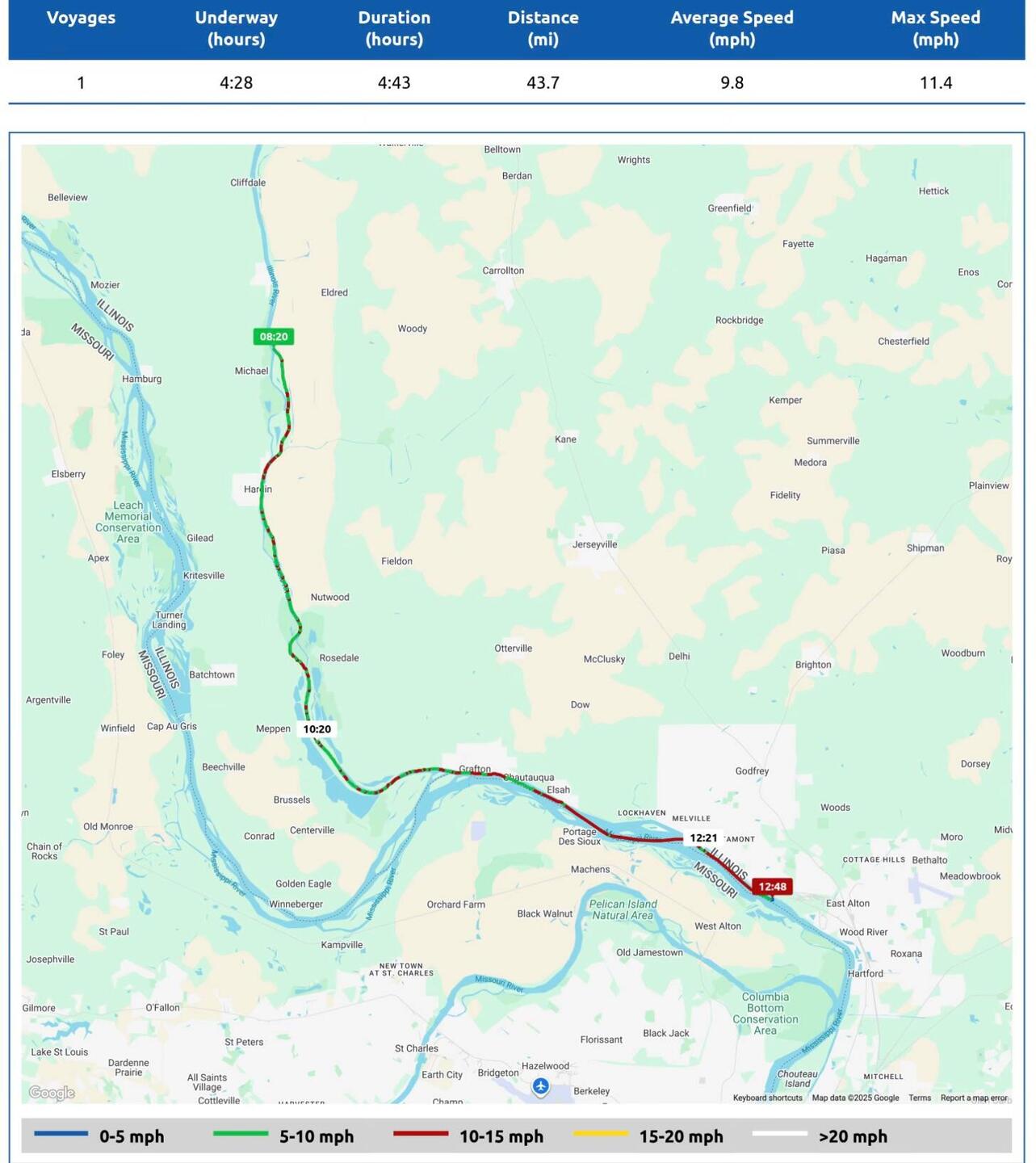 At this point we have a solid 30-knot blustery wind right on our nose, so although we're now going to benefit from the river current, we'll probably lose about 1 mph due to this wind. We cruise past St. Louis and I 'tune' into the webcam atop the arch to get a distant shot of "45 North" passing by, about 640 ft below.