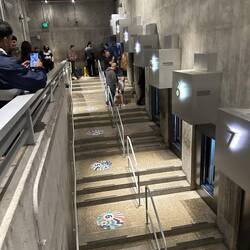 Each leg of the arch has a 'train' of 8 cars inside it that each seat 5 people. The cars are a bit like cramped ferris wheel cars. They're suspended beneath a monorail, but you're really quite unaware of this. You buy your ticket, you get allocated to a car (between 1 and 8) in either the North or South train, you receive a group briefing and watch a short history video, and you're made ready to board when your train comes down and its passengers have alighted.