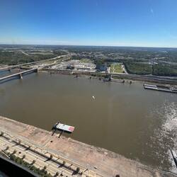 We drop about 15 feet and depart the chamber for the 6-mile run down the river to the Chain of Rocks Bypass Canal, then the 7-mile run down the canal to Lock & Dam 27... our last for a while, from which we are released into the river around midday, another 15 feet lower.
