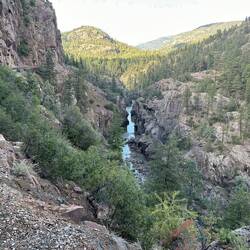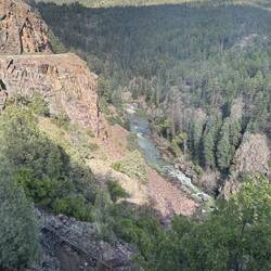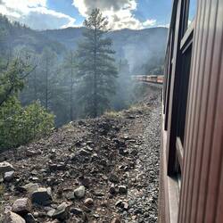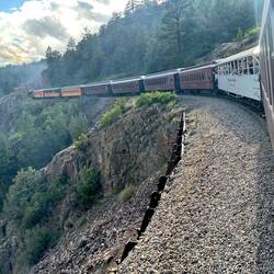 After departing Durango, the ride follows the river all the way, mostly through aspen and Douglas fir in the lower elevations, with Ponderosa pine also common. Higher elevations feature more specialised mountain flora like a spruce type, subalpine fir, and something a car host called Limber pine (the name coming from the species’ exceptionally flexible twigs, which can even be tied into a knot without breaking - a characteristic that helps it survive in harsh, windswept environments). There is a fairly brief but spectacular portion of trackage around a couple of canyon bluffs about 400 ft above the river.