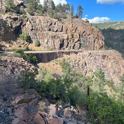 I drop down a valley beside Mineral Creek and arrive in Silverton. Just to tempt and tease me, I spot an engine in steam on the turning wye, but I know I'll be back here in two days' time on that train, so I continue back up into the mountains and on to Durango. At one point, I round a curve and find myself in a queue to wait for an hour for roadworks to be completed, and the road to open. Taking a walk as we wait, I feel that faint nausea feeling again and a degree of breathlessness just from walking uphill along the road. I expect I'll acclimatise.