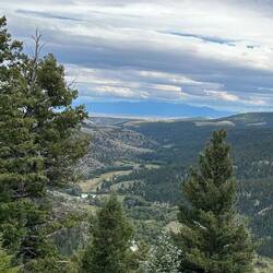 Wildlife (all of it elusive) that can apparently be seen includes deer, elk, black bear, bighorn sheep, mountain lions and moose as well as eagles, hawks, osprey, geese, squirrels, marmots and fox. We see one bear (ambling across a grassy field about a half mile away), a deer or two and some large birds that no-one was able to identify.