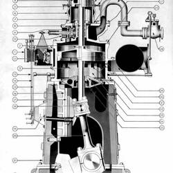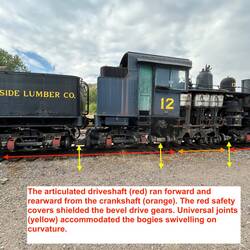 The Shay locomotive had a simple-expansion vertical engine arranged on the right-hand side. Its crankshaft was coupled to drive shafts that extended forward and backward and drove every axle (including the tender) via straight bevel gears.