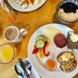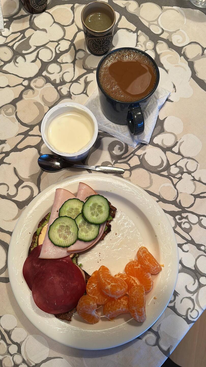 Kyllä tuli ikävä omaa tyynyä (mikä oli autossa 😩) yöllä! Onneksi aamupala oli erittäin maittava, ja oli sitä leipäjuustoa puolisolle myös 😋