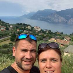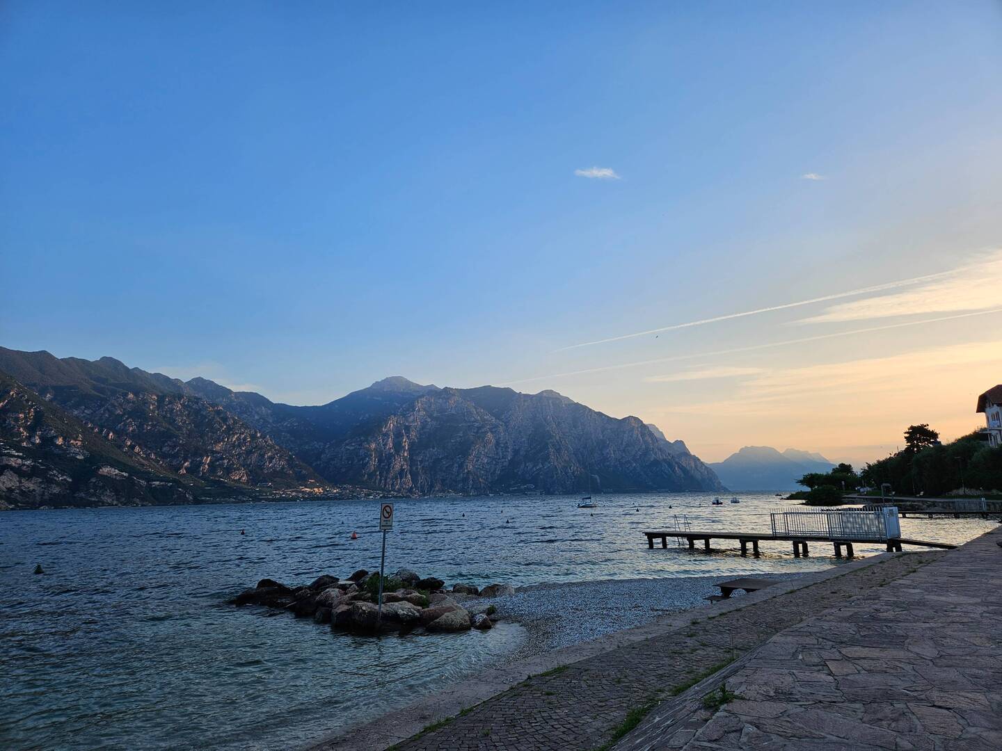 Nach einer entspannten Nacht in unseren Wohnmobil frühstücken wir am Gardasee, danach flanieren wir über die Promenade.