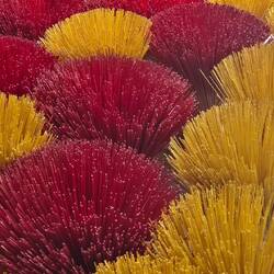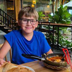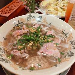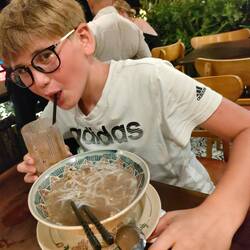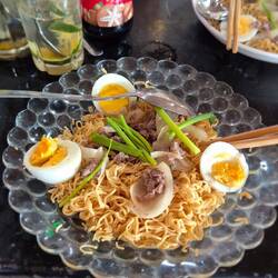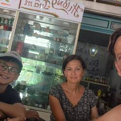 Déjeuner chez l'habitant ( restaurant de trois tables installées sur sa terrasse.) Pas de menu au choix : nouilles aux œufs et bœuf, dans le village de fabrication d'encens de Thủy Xuân.