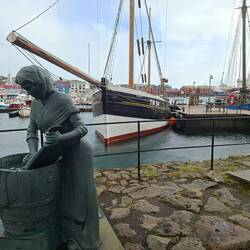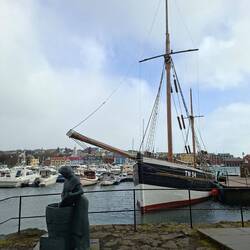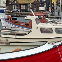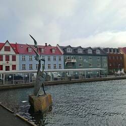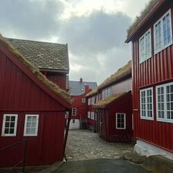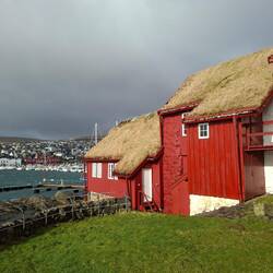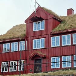Vous connaissez le drapeau D (Delta) avec 3 bandes horizontales, jaune (étroite) - bleue (large) - jaune (étroite) dans le code international des signaux maritimes ? C'est celui qui signifie "ne me gênez pas, je manœuvre avec difficulté". C'est celui qu'on a hissé ce matin quand on est descendu du bateau pour découvrir le port de Tórshavn, capitale et plus grande ville des îles Féroé avec ses 14.000 habitants, tellement il y avait de vent ! Un vent qui nous poussait, nous bousculait et nous faisait tituber, mais qui ne nous a pas empêché de découvrir le port et les maisons typiques aux toits en herbe.