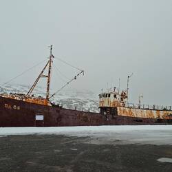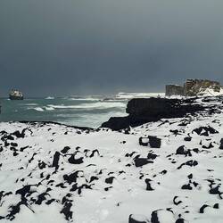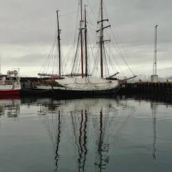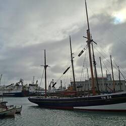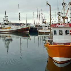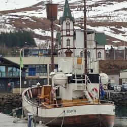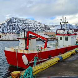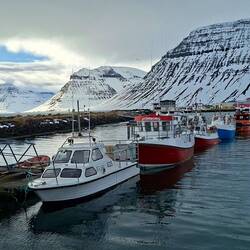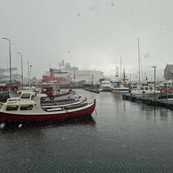 Oui, la tempête apocalyptique fait toujours rage en Islande, alors le bateau attend ici, dans un port relativement protégé.