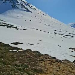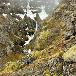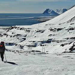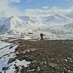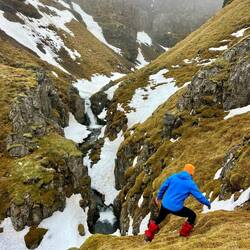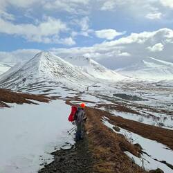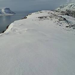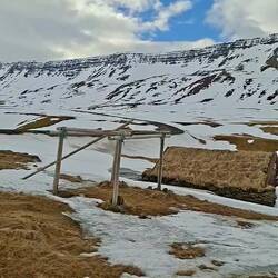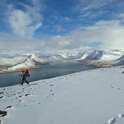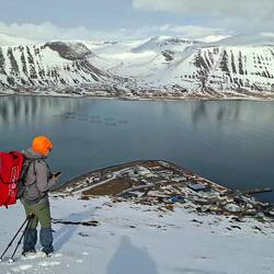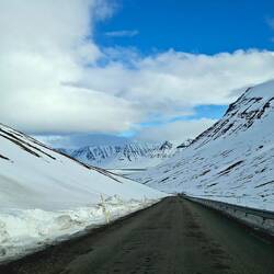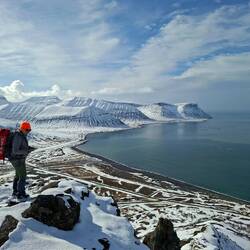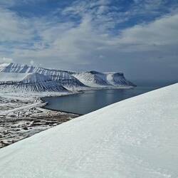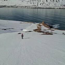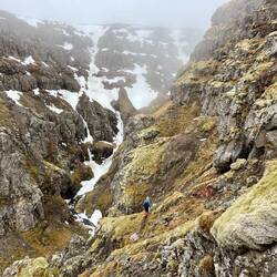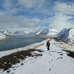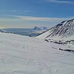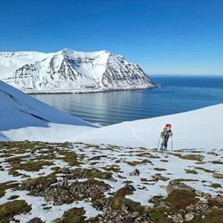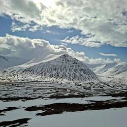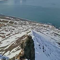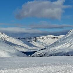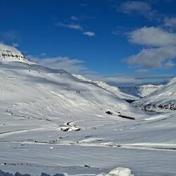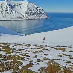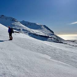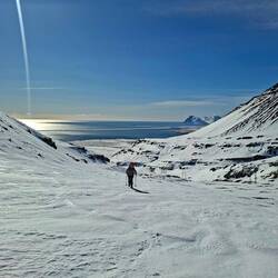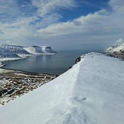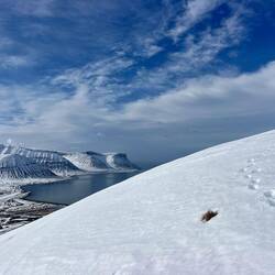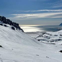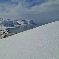 Après avoir lu nos cartes topographiques, on avait envie de monter sur le sommet Hafnarhyrna au dessus du village de Siglufjörður, mais en arrivant sur place, on ne l'a pas senti... Non pas qu'on se soit dégonflés, ce n'est pas le style de la maison, mais certains couloirs nous semblaient un peu trop exposés aux avalanches à notre goût. Et comme on a encore tellement de milliers de vadrouilles en vue dans notre vie, inutile de prendre un risque pour un sommet, non ?