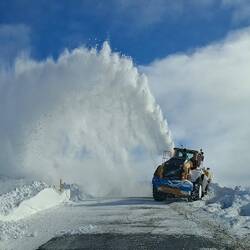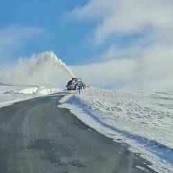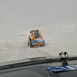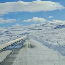 La route qu'on doit prendre pour aller sur 17 km du port d'arrivée à la première ville est actuellement fermée. Et ce n'est pas la tempête vent-neige de demain qui devrait arranger la situation !