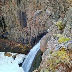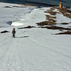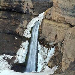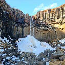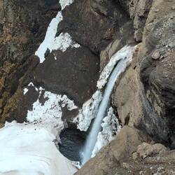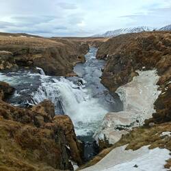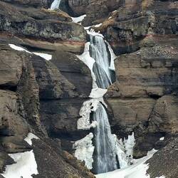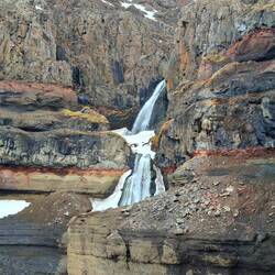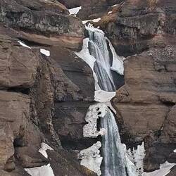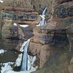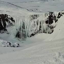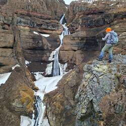 Raquettes aux pieds, jusqu'à la cascade Fardagafoss. Aujourd'hui, c'etait l'échauffement ! Pas long, pas compliqué, juste de quoi se remettre les jambes et le dos à l'endroit. Et la tête aussi, parce que pour la première fois de notre vie, on a eu le mal de terre ! Après 5 jours sur le bateau, de retour sur terre, on avait l'impression d'avoir toujours le roulis du bateau sous nos pieds, au point de devoir nous tenir pour ne pas perdre l'équilibre ! Impressionnant !