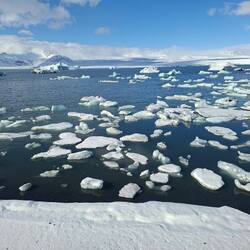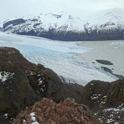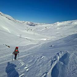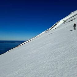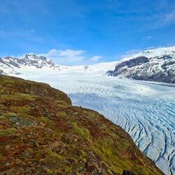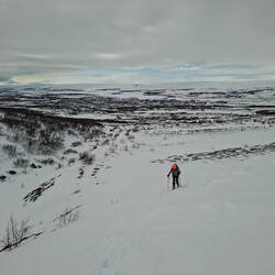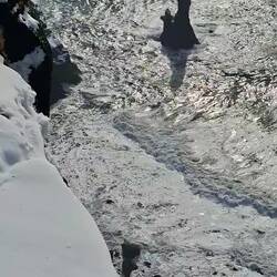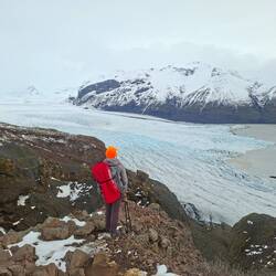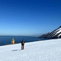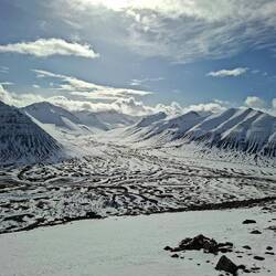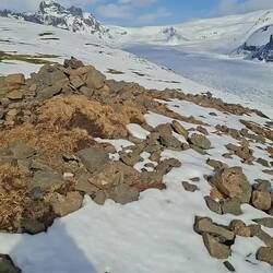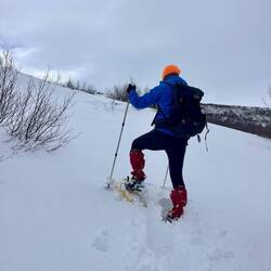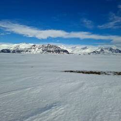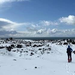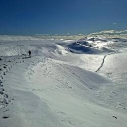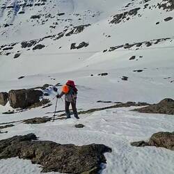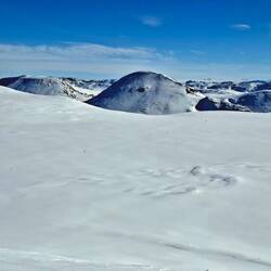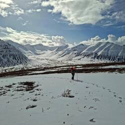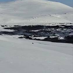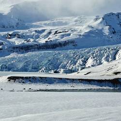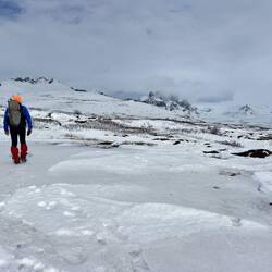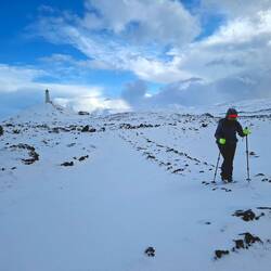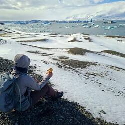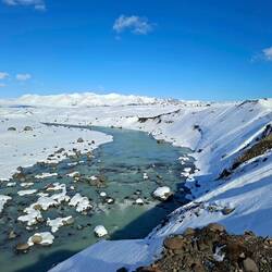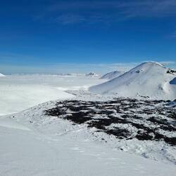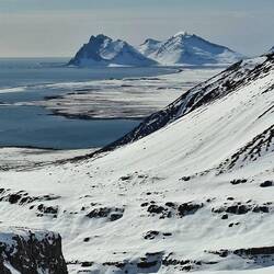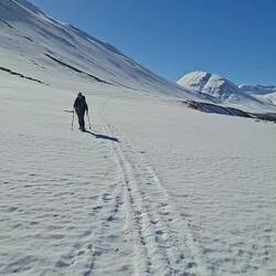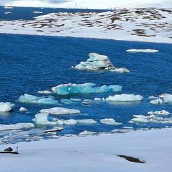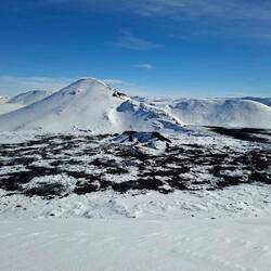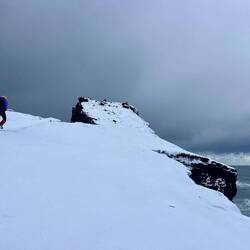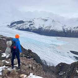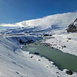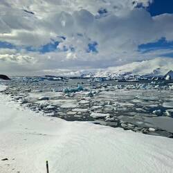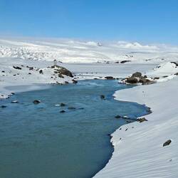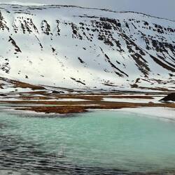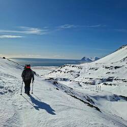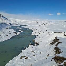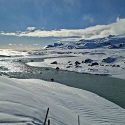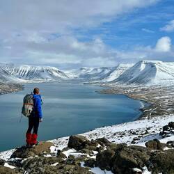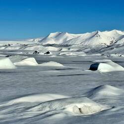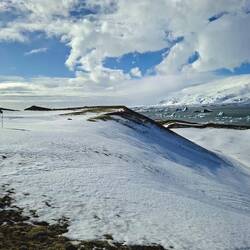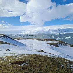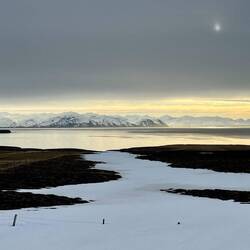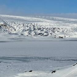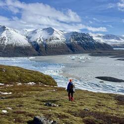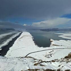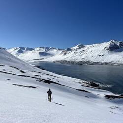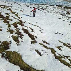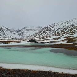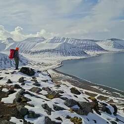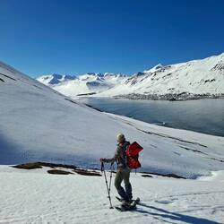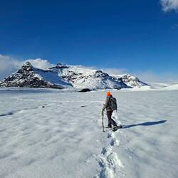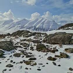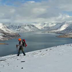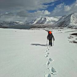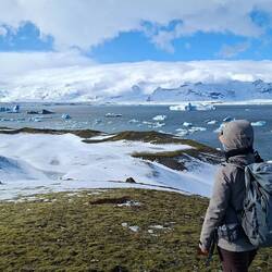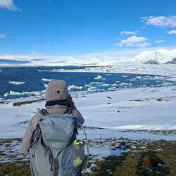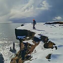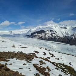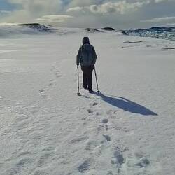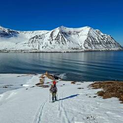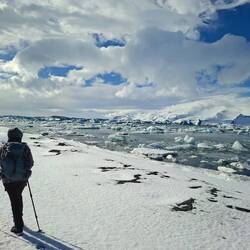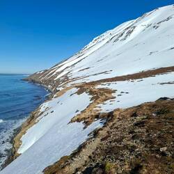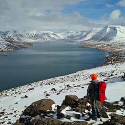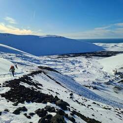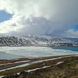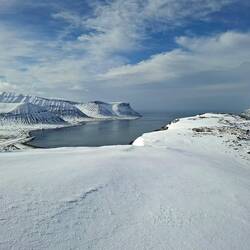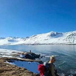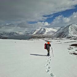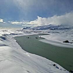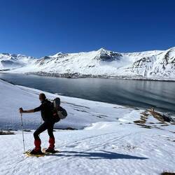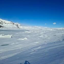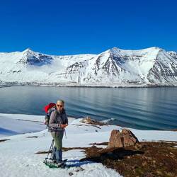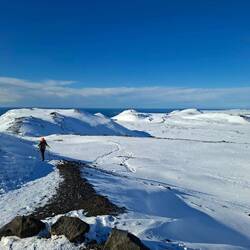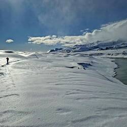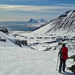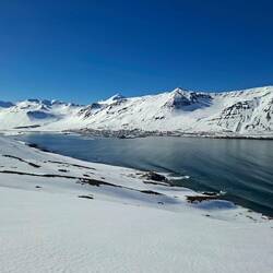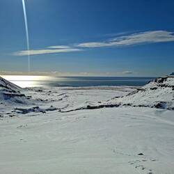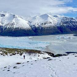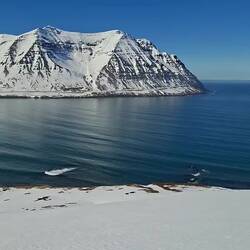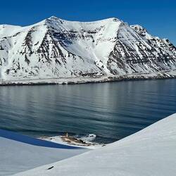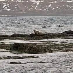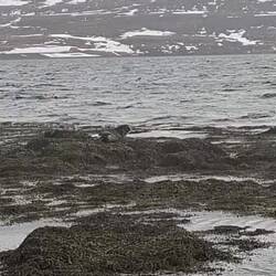 Une journée extra, vraiment, mais bien sportive, vraiment 💪😂 ! On était parti avec les crampons sur la neige gelée, mais rapidement (vu qu'il faisait trop chaud 😜 !), on s'enfonçait 1 pas sur 6 jusqu'au genou, donc on a remplacé les crampons par les raquettes (oui, on a toujours les 2 sur le sac à dos). Ça allait beaucoup mieux ainsi ! Donc on a pu profiter des paysages et panoramas extraordinaires bleu et blanc, et même de nos copains les phoques-curieux-trouillards ! Et on a pu faire travailler les cuisses pour grimper pleine pente jusqu'au magnifique cirque glaciaire de Kálfsvatn, toujours seuls au monde au milieu de la beauté, de l'immensité et du silence 💙 !