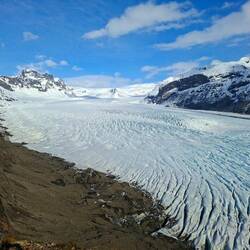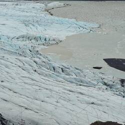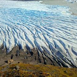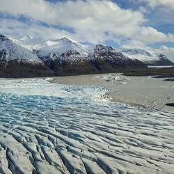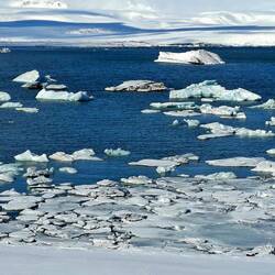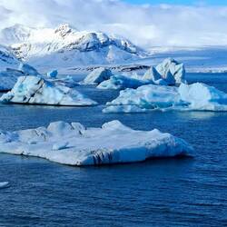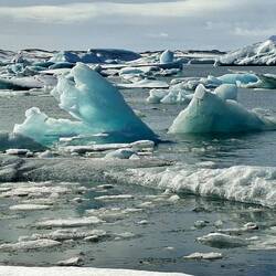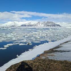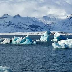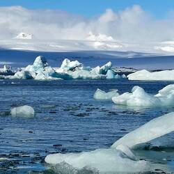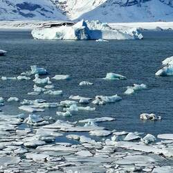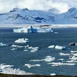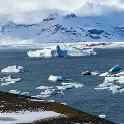 Quelques mots quand même sur ce lieu : la Jökulsárlón, toponyme islandais signifiant littéralement en français « lagune du glacier », est le plus grand des lacs proglaciaires d'Islande. Il se trouve au sud du glacier Vatnajökull. Des blocs de glace se détachent régulièrement du front de ce glacier, dérivent sur le lac, puis rejoignent la mer, où ils s'échouent alors fréquemment sur la plage de sable noir surnommée "Diamond Beach". Les couleurs de ces petits icebergs vont du blanc, au turquoise au bleu foncé, en passant par le jaune (qui vient du sulfure volcanique), le noir (qui vient de la cendre des volcans)... Tout semble magnifique dit comme ça..., sauf que le réchauffement climatique catastrophique est à l'œuvre : le glacier au bout du lac recule actuellement chaque année de 500 mètres ! 500 mètres par an ! Ce qui fait que le lac Jökulsárlón, qui faisait moins de 8 km2 il y a 50 ans, en fait maintenant presque 20 ! Catastrophe...