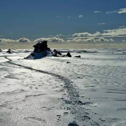 Puis marcher dans la steppe et faire comme si de rien n'était quand le vent souffle fort depuis l'Arctique et qu'il fait 3 degrés ressentis -23. Juste revisser son bonnet sur sa tête, monter son passe montagne sur son nez le plus haut possible (presque jusqu'au bonnet, lui même descendu le plus bas possible) et sourire à la nature. Et si on chante en même temps du Björk à tue-tête, ça passe encore mieux !