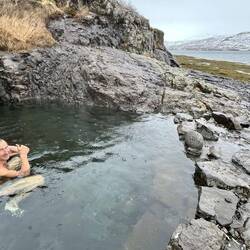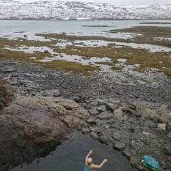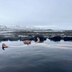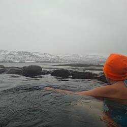 Puis aller se baigner dans la source chaude (un "heitur pottur" en islandais) du Fosslaug qui jaillit à 43 degrés des entrailles de la terre au milieu de la nature sauvage (l'eau est à 40 degrés à l'endroit où le filet d'eau chaude tombe dans le "hotpot" et à 34 à l'opposé).